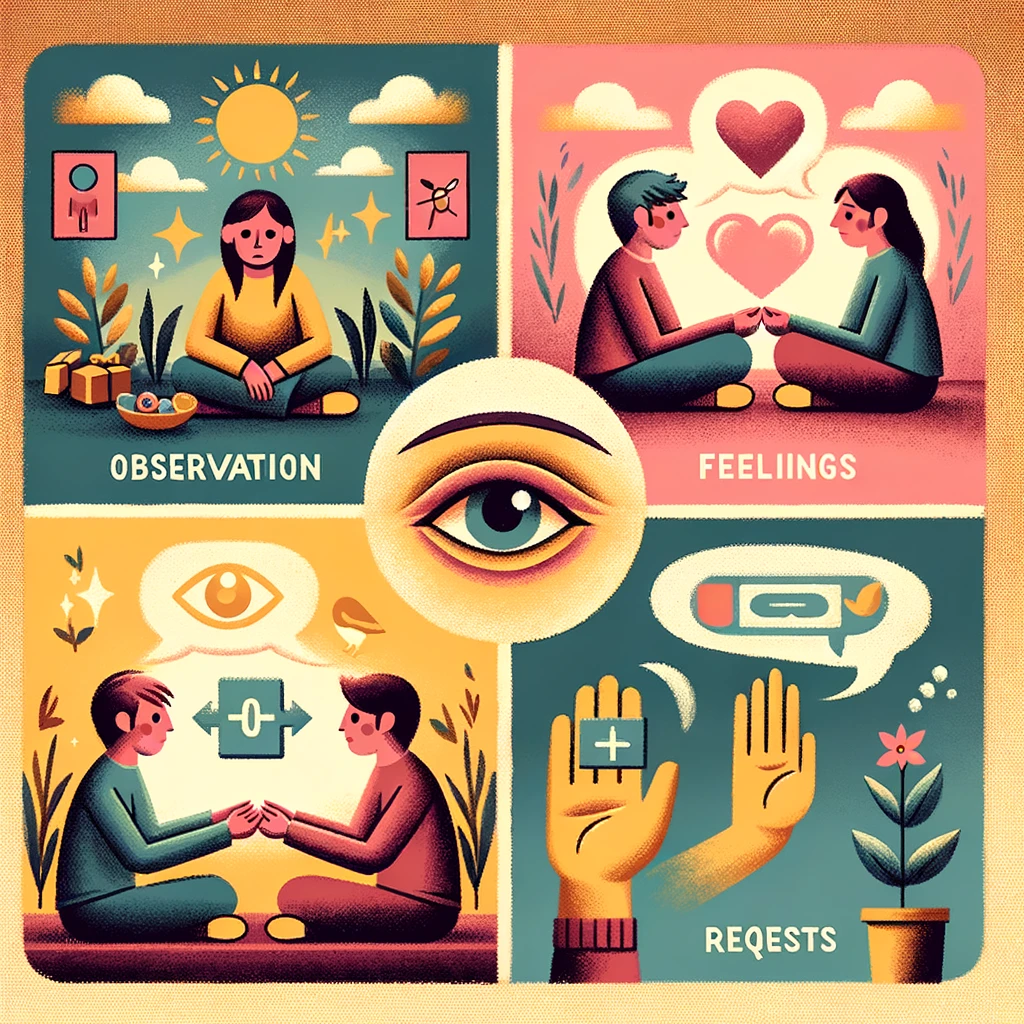 이 예시는 평가나 비난 없이 사실과 감정을 전달하고, 자신의 필요를 분명하게 표현한 후, 상대방에게 구체적인 행동을 요청하는 방식을 보여줍니다.